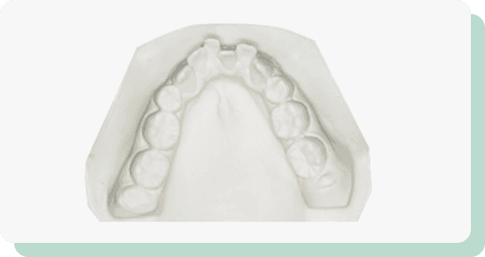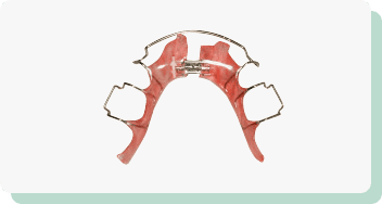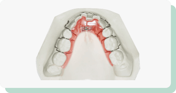床矯正装置の本体は入れ歯と同じプラスチックのプレートでできています。その内部には、スクリューやスプリングがついており、このスクリューを回すことでプレートを変化させて負荷を与え、ゆっくりあごや歯を動かし、歯並びを整えていきます。
